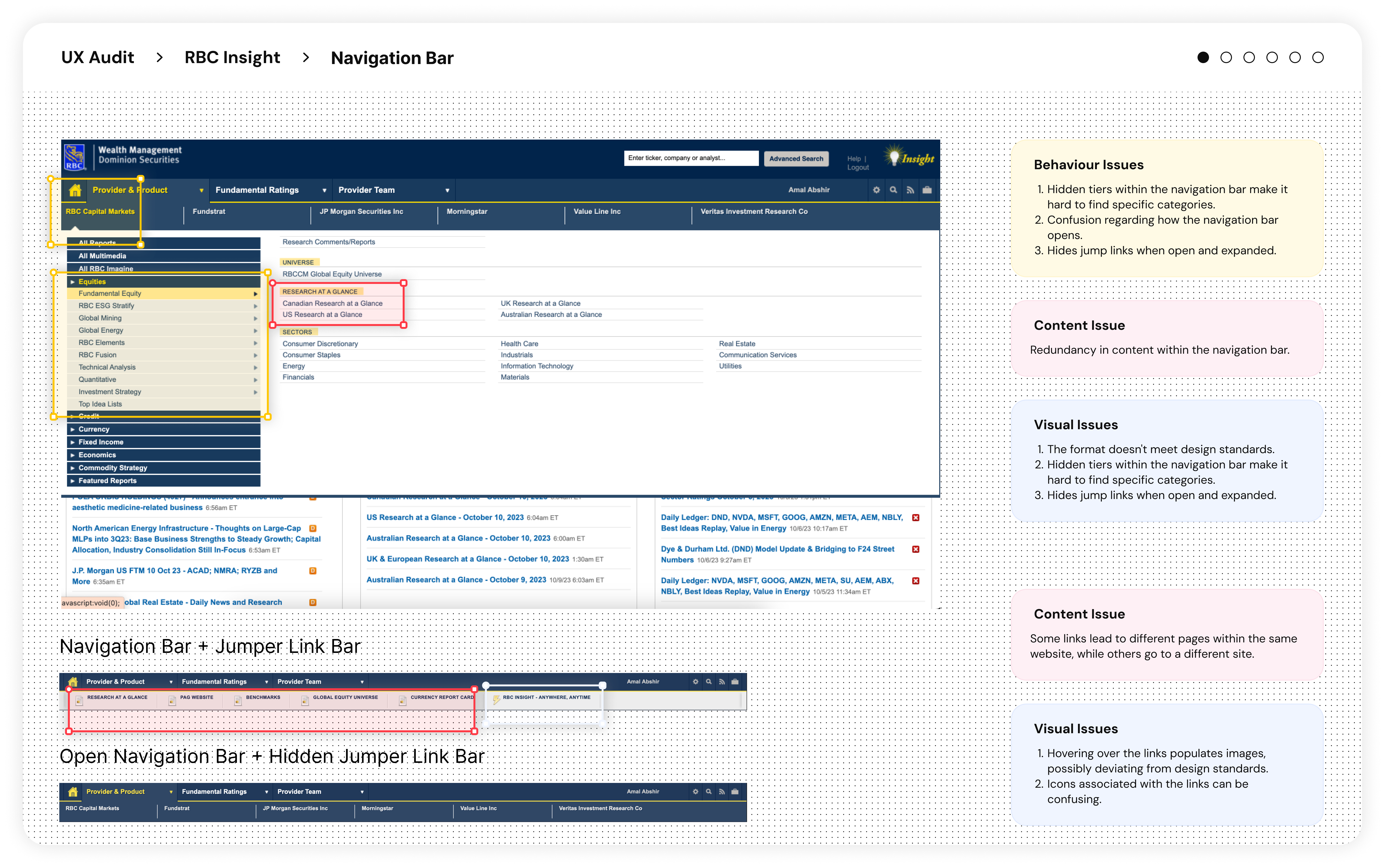 Wealth Wise began in October 2023 with a small team: myself as product designer, a design lead, product owner, and developers. Early on, the design team spotted a misalignment, the product team saw it as a simple makeover. The issue being on what our goal was, either a full full design or just a UI refresh. Being that we were divided I conducted a UX Audit. The UX audit revealed deeper flaws in RBC Insights. I used that audit to push for research and alignment, setting the tone for the project. To keep pace with business goals, the design team introduced plans like UX Lean Canvas and worked with Subject Matter Experts (SMEs). Their input was valuable, but another minor road bump occurred where I noticed decisions leaned too heavily on SME opinions instead of user needs. That’s when the design team doubled down on advocating for research until it became part of the process.